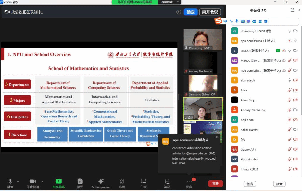 为进一步提升我院留学生招生质量,增强学院国际影响力,2024年2月21日,我院副院长都琳、国际交流与合作办公室主任肖曼玉、秘书李卓榕参与了学校2024年国际留学生招生宣讲全球直播活动。宣讲活动由国际教育学院招生办杨佳仪老师主持,以全英文直播形式,通过在线互动、图文展览、视频展播向全球宣传了我院的教育特色与教育成果。此次宣讲吸引了全世界各地近30名国际学生参加,包括俄罗斯、阿尔及利亚、埃及、巴基斯坦等国。