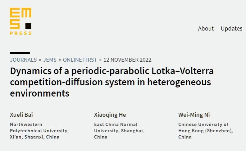 近日,a小说 分析与几何研究团队副教授白学利与华东师范大学何小清教授、香港中文大学(深圳)倪维明教授合作在带有时间周期Lotka-Volterra竞争系统解的稳定性理论研究方面取得突破,研究结果形成的55页论文“Dynamics of a periodic-parabolic Lotka-Volterra competition-diffusion system in heterogeneous enviroments”在数学综合顶级期刊Journal of the European Mathematical Society在线发表。这是本年度国内学者在该刊发表的第5篇论文,也是我校首次在该顶级期刊发文。
