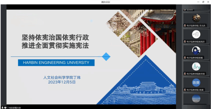 为深入学习贯彻习近平法治思想,大力弘扬宪法精神,进一步增强广大师生的宪法意识和法治素养,12月5日,a小说 、电子信息学院联合开展普法宣传教育活动,特邀哈尔滨工程大学人文社会科学学院丁玮教授通过线上形式讲授题为《坚持依宪治国依宪行政,推进全面贯彻实施宪法》的专题党课。a小说 和电子信息学院理论学习中心组成员、师生党员代表共100人参加活动。党课由a小说 党委书记王莉主持。