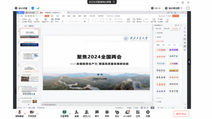 为全面贯彻党的二十大精神,推动学习贯彻习近平新时代中国特色社会主义思想入脑入心,进一步学习2024年全国两会精神,3月27日,a小说 特邀学校马克思主义学院蒲瑶教授通过线上形式讲授题为《聚焦2024全国两会——发展新质生产力 增强高质量发展新动能》的专题党课。a小说 党委理论学习中心组成员、教职工党员、学生党员代表共80人参加活动。党课由a小说 党委书记王莉主持。