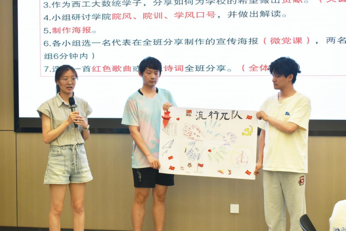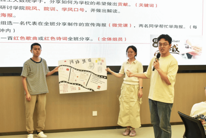 课上,王老师着重强调了团队建设的重要性。学员们被分成5个小组,围绕个人入党初心、红色榜样、红色诗词及红色精神等多个富有意义的主题,结合手绘、拼贴等艺术形式进行了创意性表达,现场气氛高涨。在王老师的指导下,各小组有条不紊地发散思维,并将讨论成果以海报的形式进行呈现。