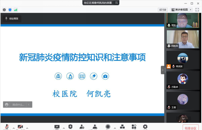 为进一步落实学校疫情防控工作有关文件精神,使学院师生党支部成员在寒假期间都能带头做到科学防控,2022年1月27日,a小说 办公室党支部经过前期精心策划,邀请校医院何凯亮副院长通过腾讯会议,面向学院理论中心组全体成员,数学科学系党支部、计算科学系党支部、应用概率统计系党支部以及部分学生党支部全体党员共计82人,在线进行新冠肺炎疫情防控知识的宣讲。