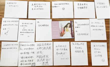 最后,教师们纷纷在小卡片上写下了各种祝福。“柔肩担重担、巾帼绽芳华”“每个人都有爱心,把它奉献出来才叫圆满”“借用董仲蠡的一句话,‘请给我5分钟的时间,做一次教育。’将会出现在我的课堂上”“努力把自己活得比昨天更好,是对所有人、对整个社会、对我们的祖国最好的回报”。一句句平实质朴的语言,诠释了最真挚细腻的情感。院长助理郭千桥作为男教师代表,也表达了对数统学院及各位女教师的美好祝福。