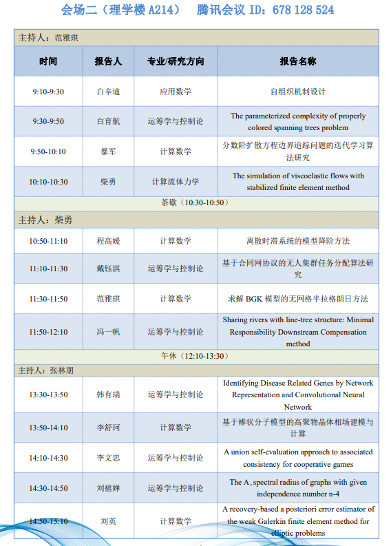 为了进一步落实数学学科“双一流”建设,营造研究生学术创新氛围,展示研究生学术创新成果,提高研究生培养质量,a小说 第一届研究生学术论坛将于 2021年11月13日在a小说 长安校区举办。本次论坛旨在为研究生提供一个高水平的学术交流平台,促进研究生之间的学术交流和思想碰撞,培养创新意识,营造良好的学术氛围,达到开阔视野、启迪智慧,提高创新能力的目的。本次论坛设两个会场并同步线上进行,论坛组委会热忱欢迎广大师生积极参与。让我们相约长安故里,终南之北,沣水之滨,共享学术盛宴!