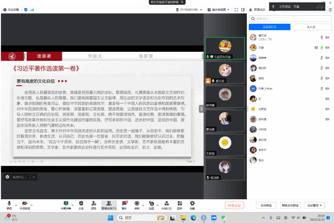 11月30日,研究生会主席团成员文渝带领大家深入学习了《习近平著作宣读第一卷》中的《要有高度的文化自信》一文。优秀的文艺作品具有增强文化自信的重要功能。任何一个时代的经典文艺作品,都是那个时代社会生活和精神的写照,都具有那个时代的焰印和特征,在马克思主义理论中,文艺可以反映人们的现实生活情况,反映经济、政治、社会、生态状况,在不同历史阶段,文艺作品的内容会随着所处发展阶段状况的变化而不断变化。习近平总书记强调:“任何一个时代的文艺,只有同国家和民族紧紧维系、休戚与共,才能发出振聋发聩的声音。”因此,中国的文艺作品,必须植根于中华文化的血脉,符合中华民族的价值追求。新时代文艺工作者要始终把握好“变”与“不变”的辩证关系,创作出弘扬社会主义核心价值观、展现中华民族伟大复兴时代风貌的优秀文艺作品,为增强中华民族文化自信贡献力量。