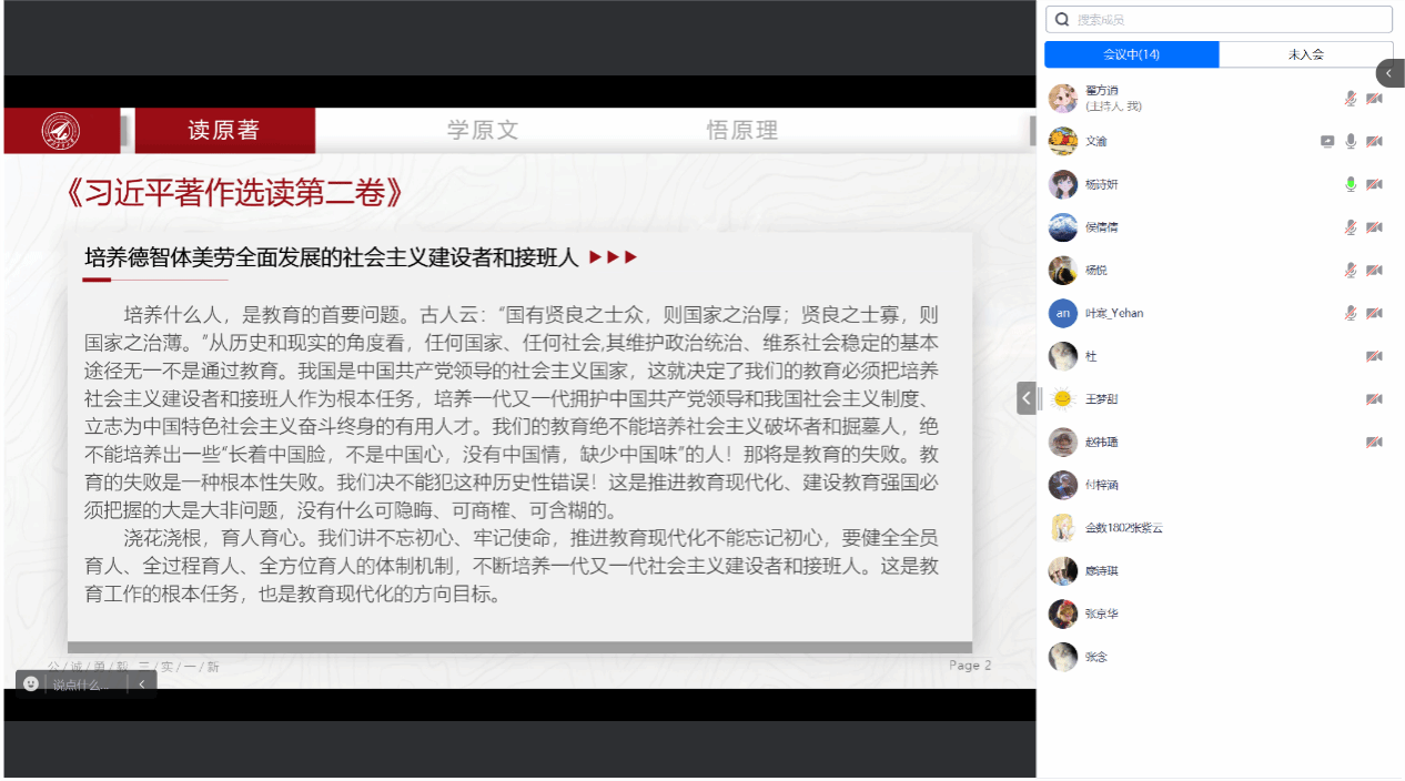 12月7日,在线上读书分享会中,研究生会主席团成员杨诗研带着大家学习了《习近平著作选读第二卷》--培养德智体美劳全面发展的社会主义建设者和接班人。培养什么人,是教育的首要问题。古人云:“国有贤良之士众,则国家之治厚;贤良之士寡,则国家之治薄。”从历史和现实的角度看,任何国家、任何社会,其维护政治统治、维系社会稳定的基本途径无一不是通过教育。我国是中国共产党领导的社会主义国家,这就決定了我们的教育必须把培养社会主义建设者和接班人作为根本任务,培养一代又ー代拥护中国共产党领导和我国社会主义制度、立志为中国特色社会主义奋斗终身的有用人才。我们的教育绝不能培养社会主义破坏者和掘墓人,绝不能培养出一些“长着中国脸,不是中国心,没有中国情,缺少中国味”的人!那将是教育的失败。教育的失败是一种根本性失败。我们决不能犯这种历史性错误!这是推进教育现代化、建设教育强国必须把握的大是大非问题,没有什么可隐晦、可商榷、可含糊的。
