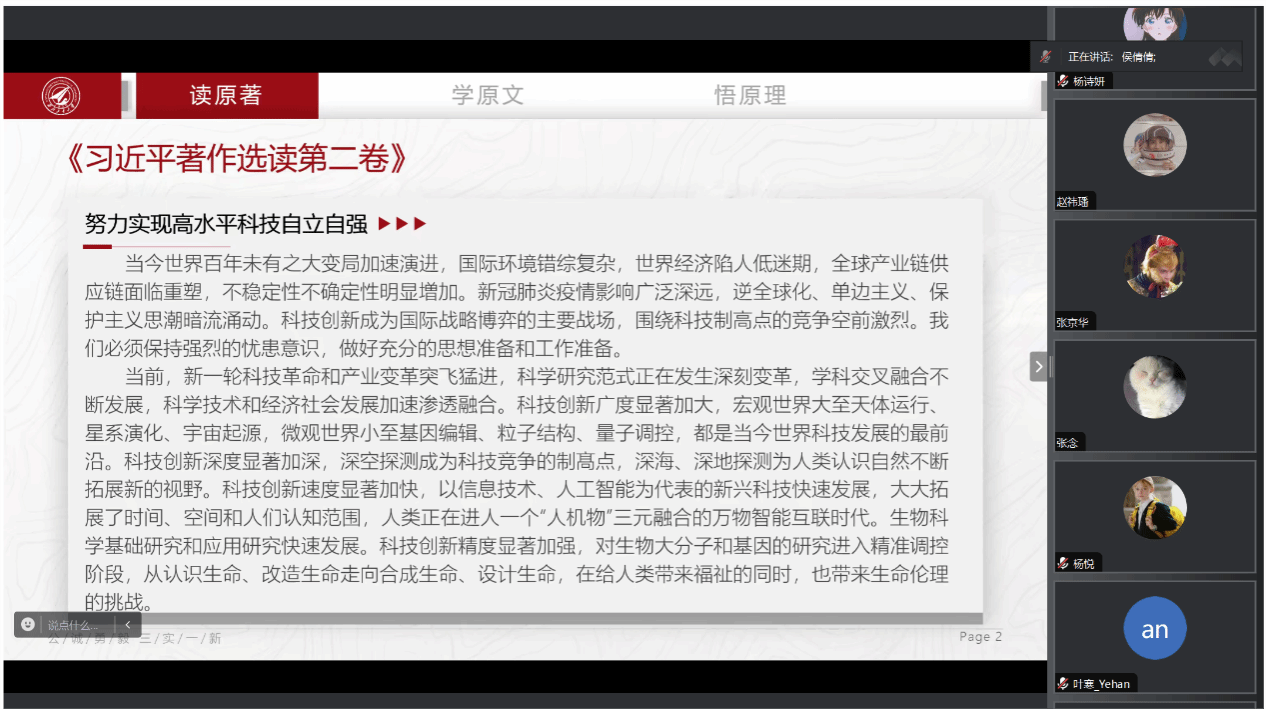 12月14日,在线上读书分享会中,研究生会成员侯倩倩带着大家学习了《习近平著作选读第二卷》--努力实现高水平科技自立自强。当今世界百年未有之大变局加速演进,国际环境错综复杂,世界经济陷人低迷期,全球产业链供应链面临重塑,不稳定性不确定性明显増加。新冠肺炎疫情影响广泛深远,逆全球化、单边主义、保护主义思潮暗流涌动。科技创新成为国际战略博弈的主要战场,围绕科技制高点的亮争空前激烈。我们必须保持强烈的忧患意识,做好充分的思想准备和工作准备。