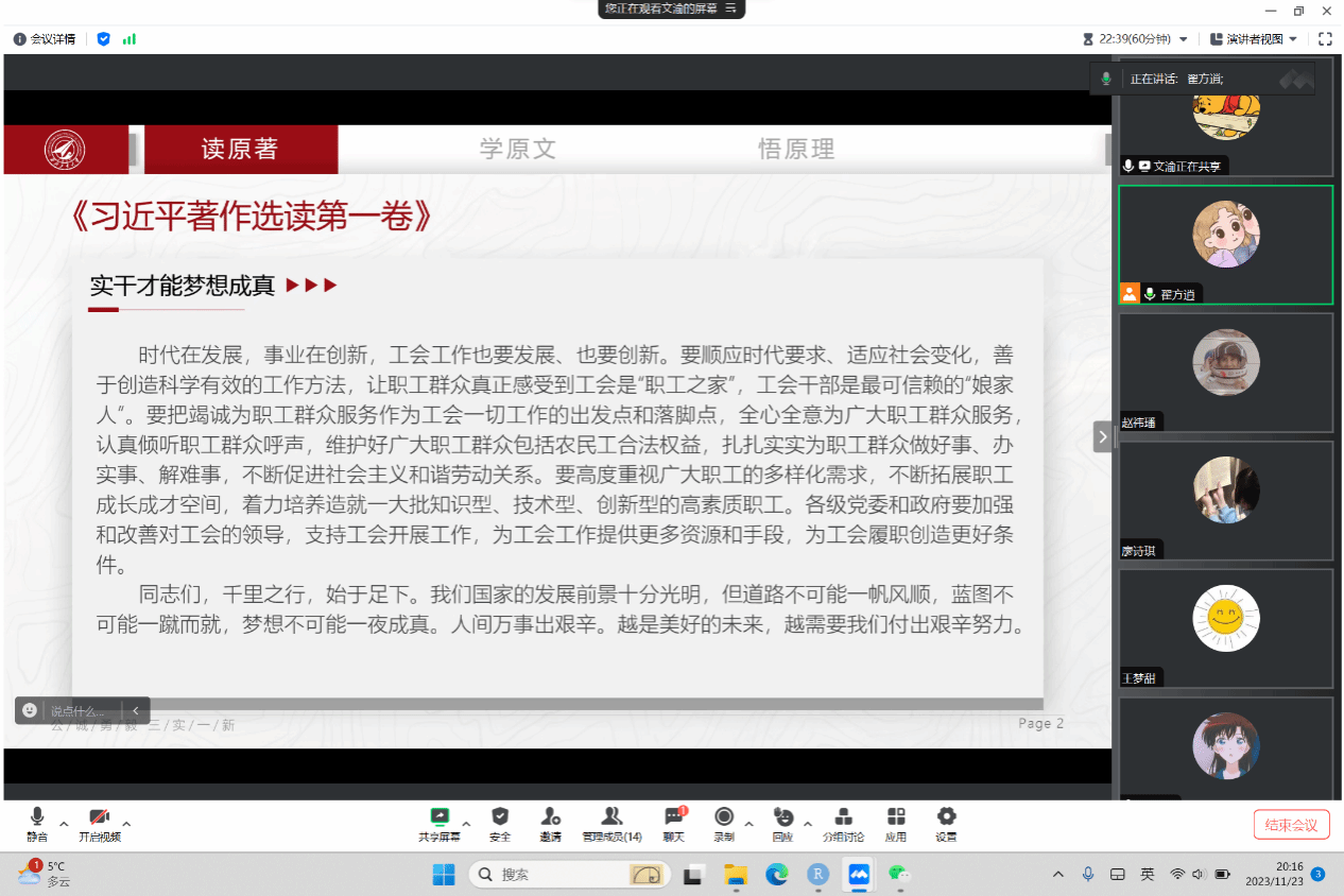 在11月23日,研究生会执行主席翟方逍带领大家深入学习了《习近平著作宣读第一卷》中的《实干才能梦想成真》一文。在这篇讲话中,同学们深刻领悟到了“幸福是奋斗出来的”“天上不会掉馅饼,只有努力奋斗才能实现梦想”的道理。习近平总书记的系列讲话涵盖了丰富多彩的“实干精神”,其中强调了对实干的崇尚,也展现了总书记敢于奋斗的人格魅力。这些内容既展现了对实干精神的高度认可,也呼吁人们积极投身于奋斗之中,彰显了对奋斗精神的赞颂。