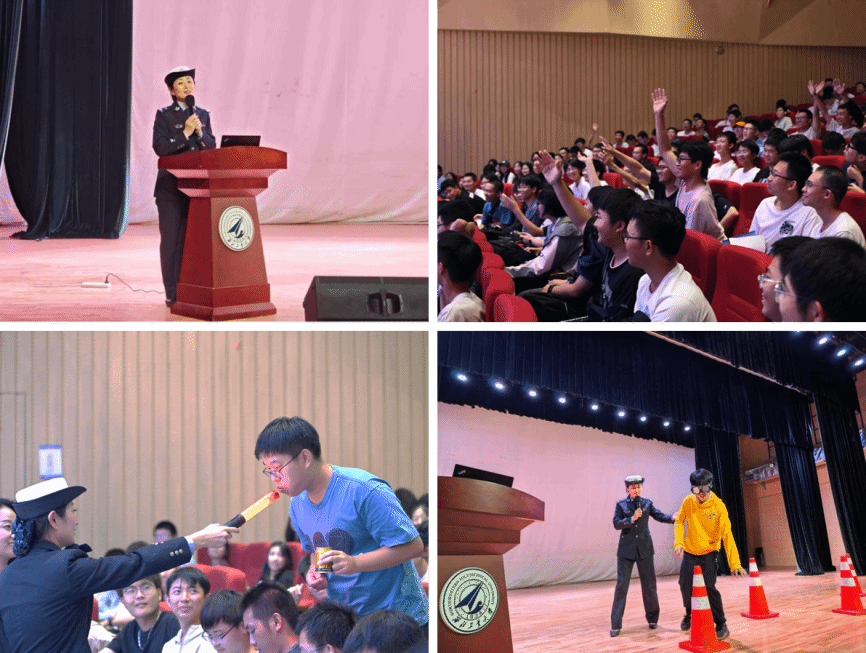 最后,西安市公安局交通管理支队碑林大队刘潇泽警官以“细节决定平安,习惯守护未来”为主题,为新生上了一堂生动的交通安全课。刘警官通过交通事故现场视频,直观展示交通违法行为的严重后果。为加深同学们对酒驾危害的认识,现场还设置了互动体验环节,让同学们沉浸式感受酒后驾驶的危险性,强化交通安全意识。