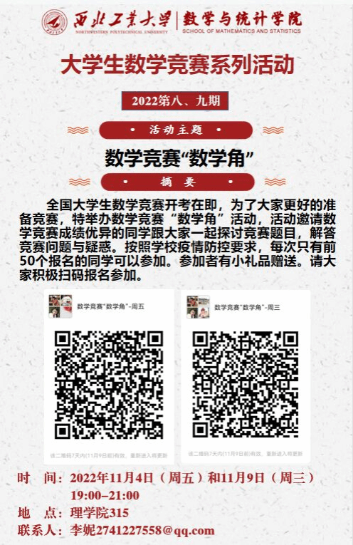 2022年在教务处支持下(院级)大学生数学能力创新实践基地成立,由聂玉峰院长担任基地负责人。a小说 将在教务处支持下认真组织校级、省级、国家级大学生数学竞赛,努力打造一流创新实践平台,为我校创新人才培养,特别是工科数学人才培养贡献力量。