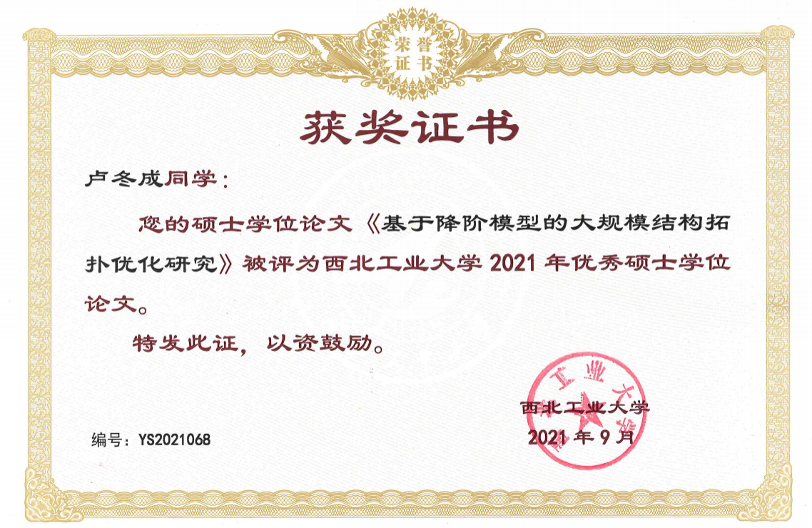 个人简介:卢冬成,男,计算数学专业,师从肖曼玉副教授,研究方向为基于缩减模型的大规模结构拓扑优化,致力于解决拓扑优化设计自由度大、效率低的重难点问题。硕士学习期间,参与国家自然科学基金、中央高校基金、省基金等多个项目,主持并完成a小说 研究生创意创新种子基金项目1项,积极参与多项重大基金和项目以及国内外学术会议,共发表3篇高水平学术论文,为大规模拓扑优化的学术研究和工程应用提供了一定参考价值。荣获硕士研究生国家奖学金等多个奖项,并荣获2021年优秀毕业生称号。