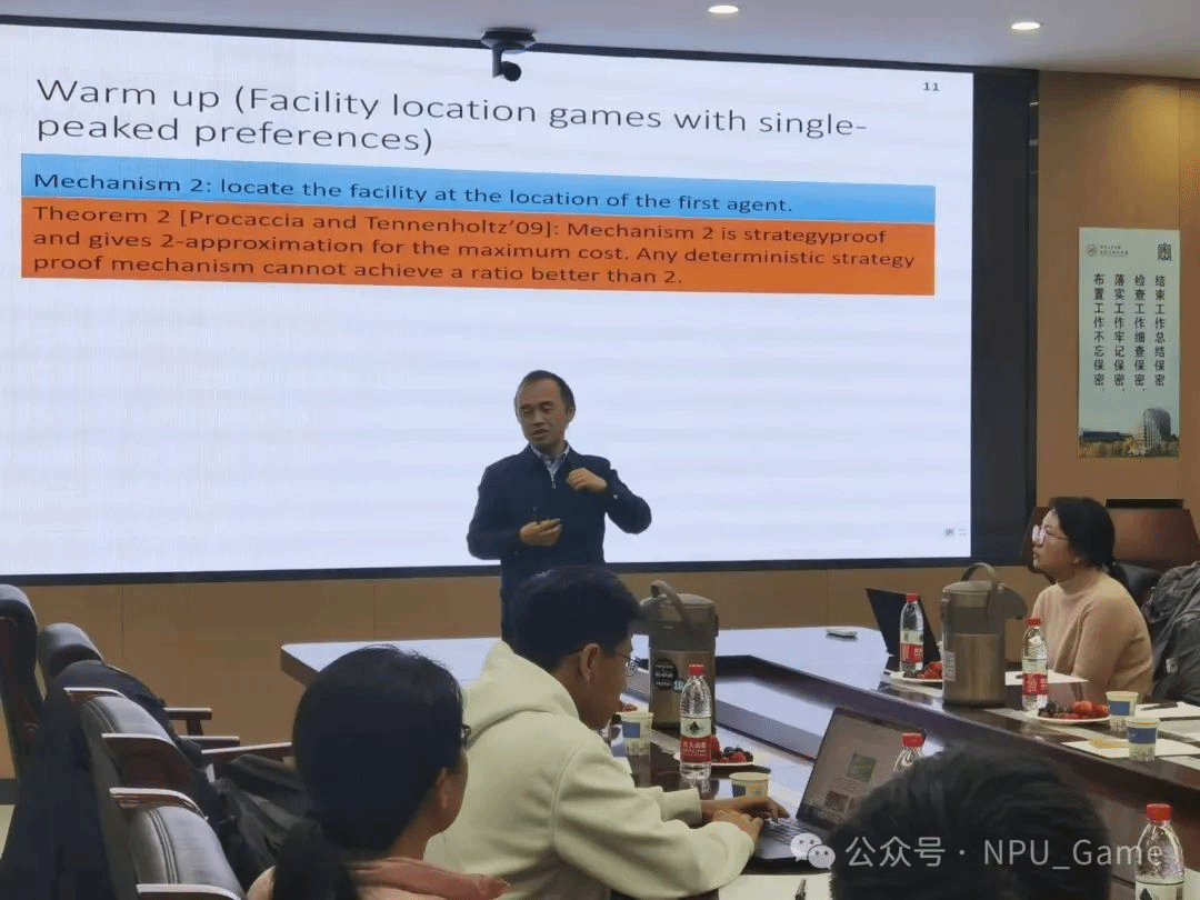 李闽溟教授深入探讨了设施选址博弈的机制设计问题,通过丰富的生活实例,生动地展示了该博弈的背景和相关研究议题。随后,李教授介绍了设施选址博弈的最新研究进展,并阐述了如何利用网络效应等手段来优化博弈解的过程。