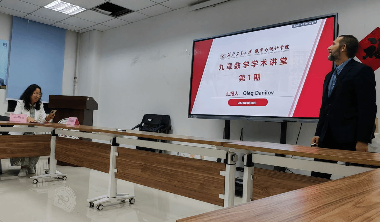 为深入贯彻落实《a小说 科技工作高质量发展行动计划》,切实活跃学院科研交流氛围,提升有组织科研能级,a小说 开展“九章数学系列学术报告”活动。2023年9月28日,第一期“九章数学学术讲堂”在启翔楼357进行,讲堂邀请俄罗斯新西伯利亚国立大学Oleg Danilov教授主讲,我院党委书记王莉、院长聂玉峰、副院长都琳、国际交流与合作办公室主任肖曼玉等20余位教师和学生参会,会议由肖曼玉主持。