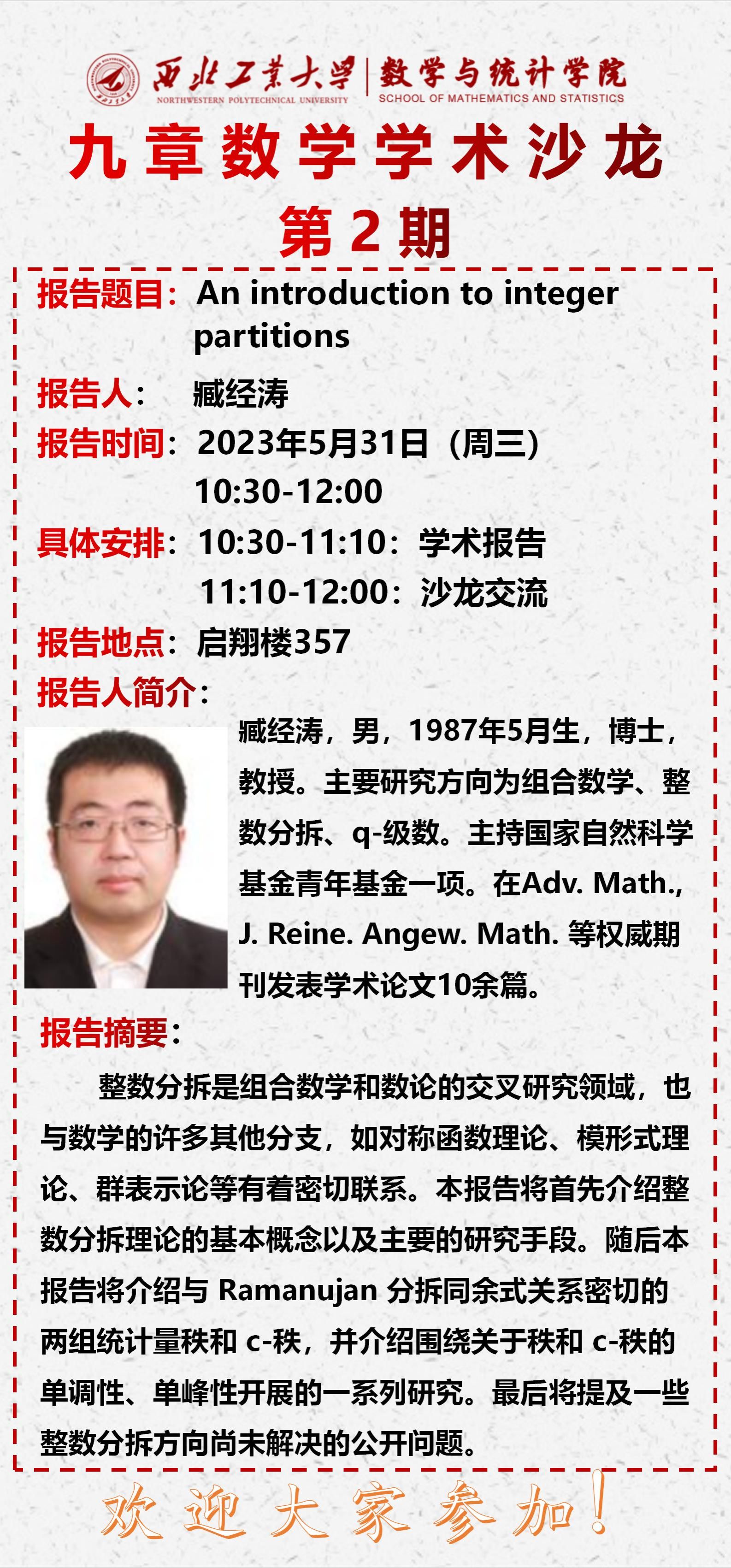 2023年5月31日,a小说 第二期“九章数学学术沙龙”在启翔楼357举行。a小说 臧经涛教授做了题目为《An introduction to integer partitions》的报告,都琳副院长、钮鹏程教授、陆由教授、以及学院20余位教师和学生参加,会议由二级学科负责人白延东副教授主持。