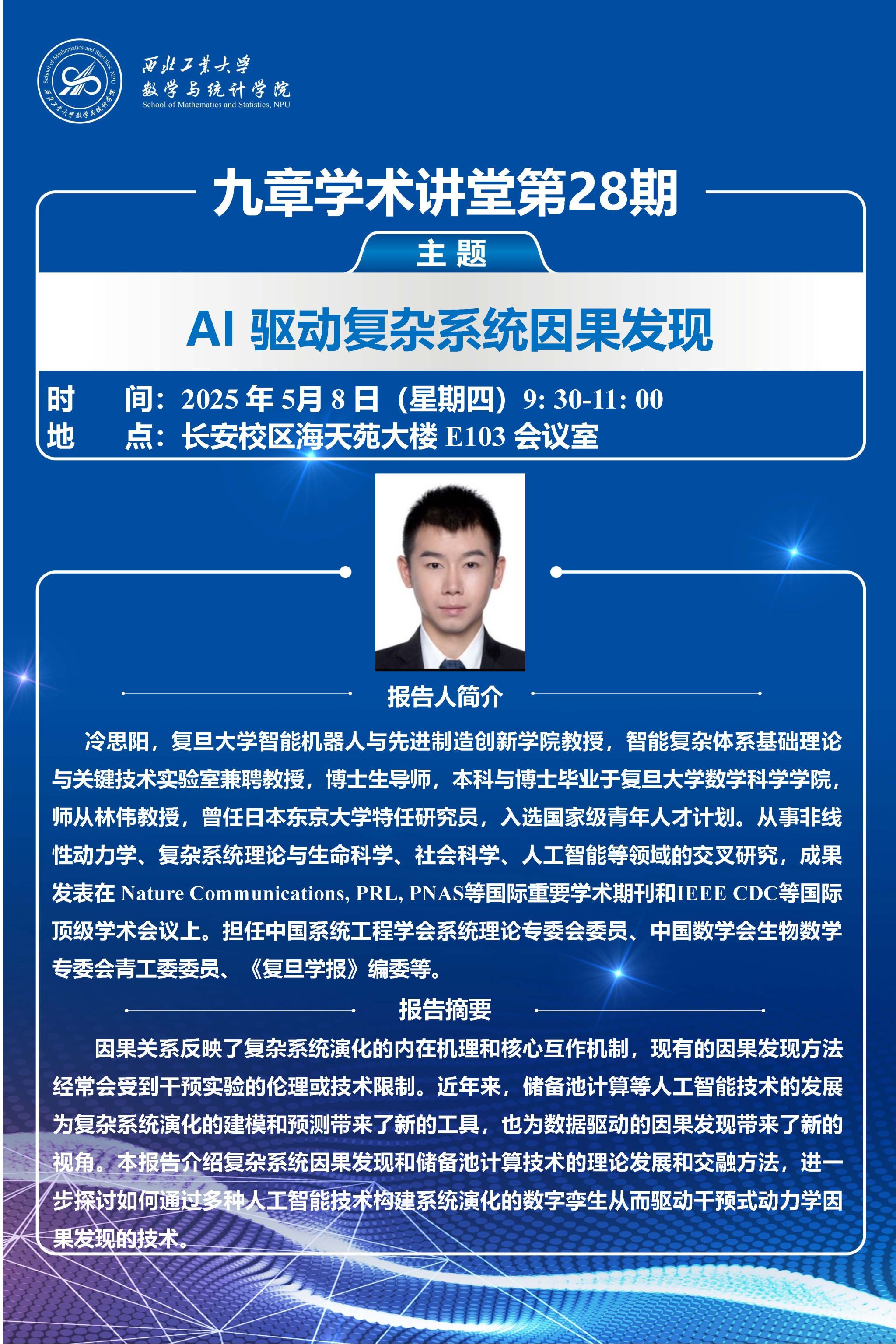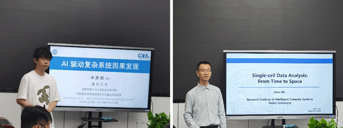 2025年5月8日,a小说 第28、29期“九章学术讲堂”成功举办。讲堂邀请复旦大学智能机器人与先进制造创新学院冷思阳教授和复旦大学智能复杂体系基础理论与关键技术实验室史际帆副研究员,分别作题为“迁移学习下单细胞空间位置推断”和“AI驱动复杂系统因果发现”的报告,并与我院教师围绕科研合作进行座谈。学院20余位师生参会,报告由裴斌教授主持。