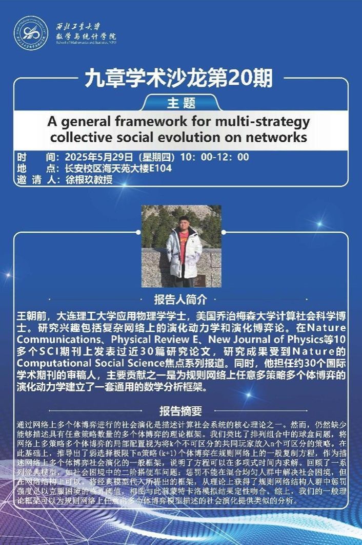 5月29日,美国乔治梅森大学(George Mason University)计算社会科学博士王朝前到访a小说 ,为我院师生带来题为《A general framework for multi-strategy collective social evolution on networks》的学术分享。学院20余位师生参会,会议由副院长徐根玖教授主持。