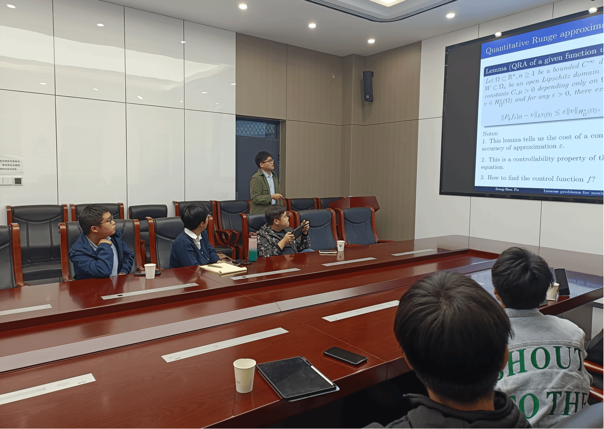 符松韧在报告中聚焦分数阶椭圆方程的反问题,系统介绍了分数阶拉普拉斯算子的常见性质、反问题的研究情况和现状以及本人关于半线性分数阶椭圆方程系数反演稳定性方面的研究成果。报告结束后,符松韧与在场师生展开了热烈讨论,现场学术氛围浓厚。
