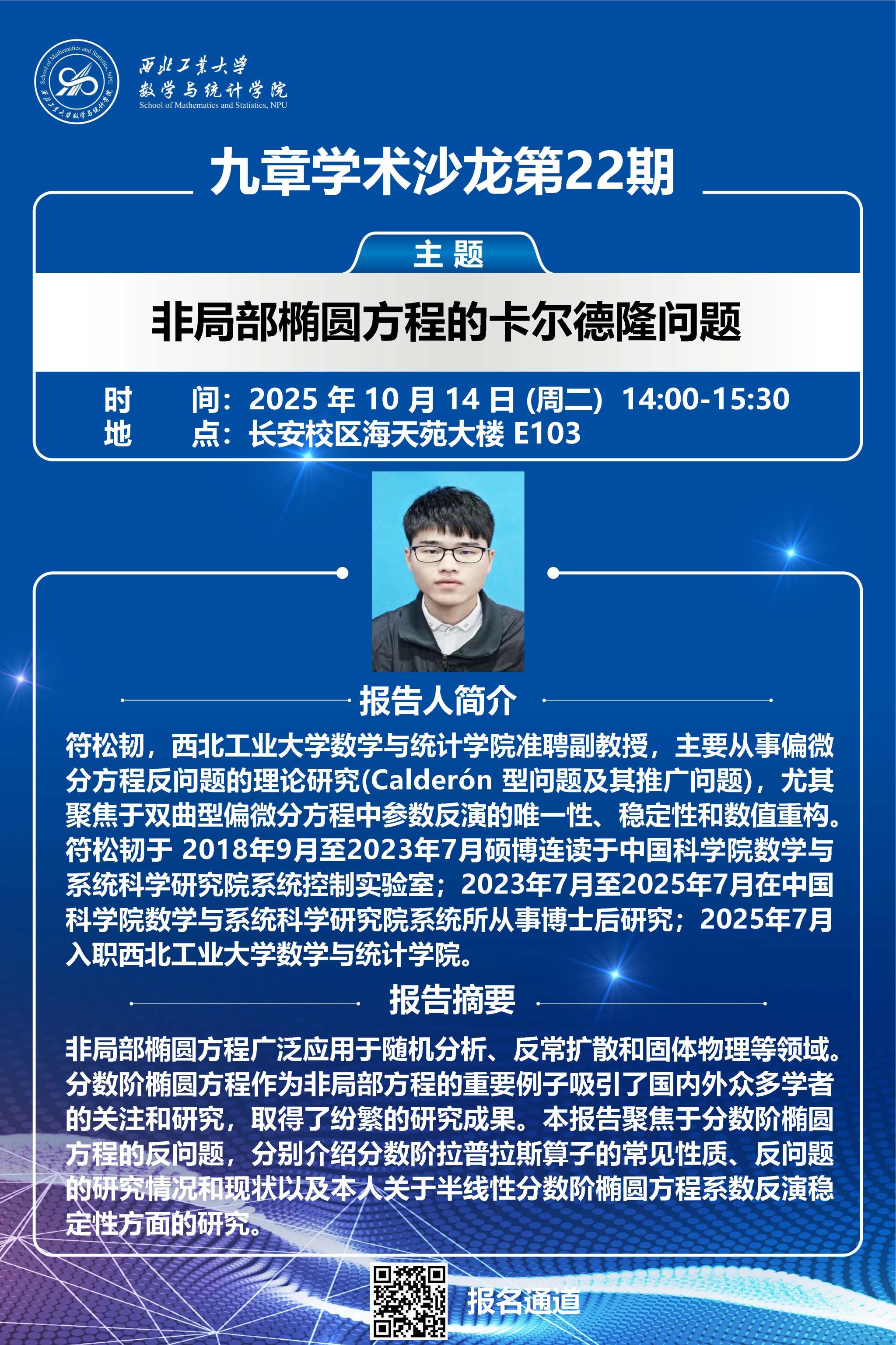 为促进学院教师之间的学术交流与合作,2025年10月14日,a小说 顺利举办第22期“九章学术沙龙”。本期活动特邀我院符松韧副教授作题为“非局部椭圆方程的卡尔德隆问题”的学术报告。报告会由夏健康副教授主持,吸引了学院十余位师生的积极参与。