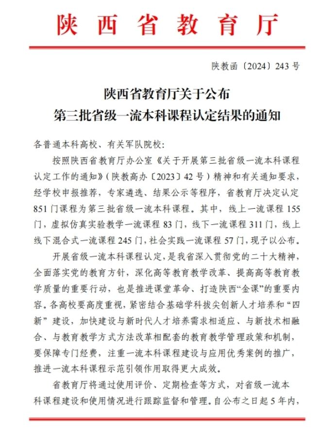 近日,陕西省教育厅公布了第三批省级一流本科课程认定结果,我院4门课程获批省级一流本科课程。截至目前,学院共获批国家级一流课程6门,省级一流课程12门。