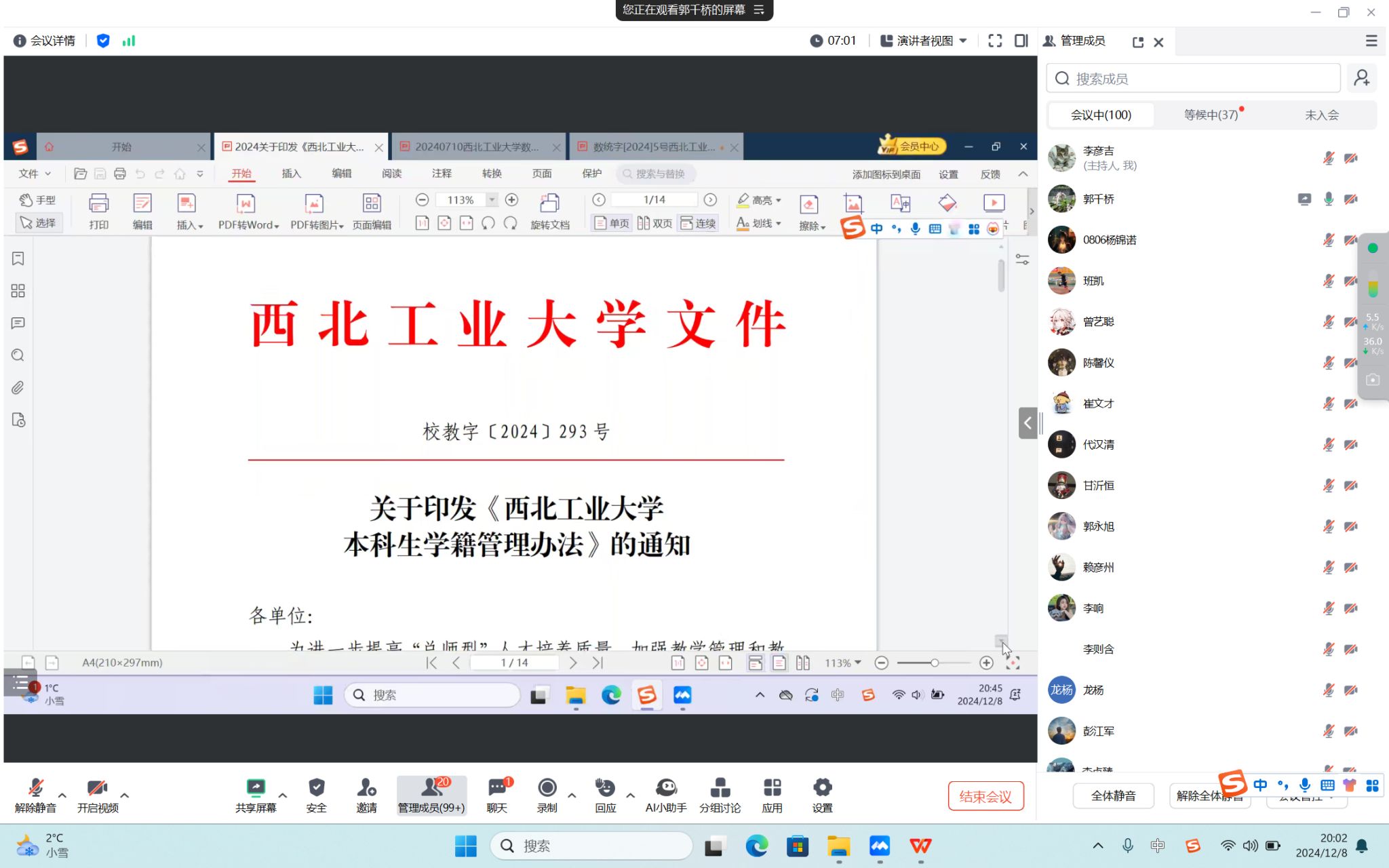 为帮助2024级新生了解我校学籍管理政策与相关制度,a小说 于2024年12月8日晚20:00点召开了2024级本科生学籍管理政策线上宣贯会。学院副院长郭千桥,院长助理、学院学生工作办公室主任兼2024级辅导员班凯,班主任白建超、韩军强、彭江军、乔艳,教学秘书李彦吉和学院2024级149名新生参加了本次活动。