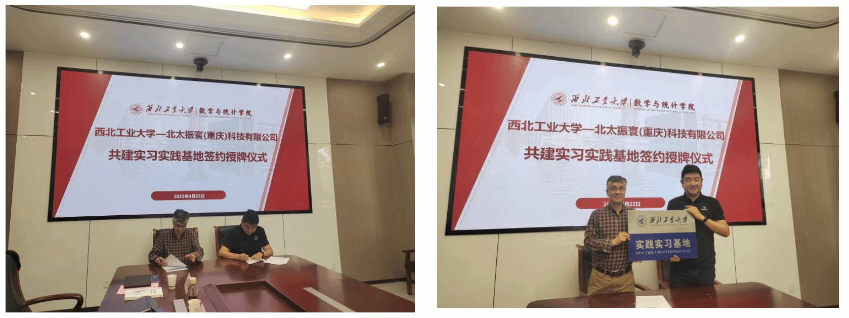 在热烈的掌声中,聂玉峰和廖汉卿分别代表双方签订了《a小说 —北太振寰(重庆)科技有限公司共建实习实践基地协议》。随后聂玉峰代表学院向北太振寰授予实践实习基地牌匾。
