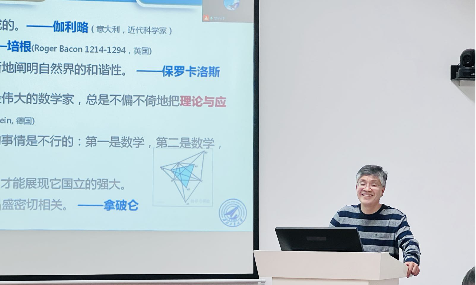 最后聂玉峰院长做题为“大学数学教学漫谈—从数学建模与连续介质力学谈起”的交流分享。介绍了数学教学无定法,但有可遵循理念,以《礼记•中庸》和各位数学家的思想为例阐述大学数学教育教学新理念。并以对数学建模过程和连续介质力学课程的剖析作为出发点,阐述教学改革思路,要通过课堂示范促进学生能力提升和学习方法转变,激发学习兴趣,体验成就感,从而达成兴趣造就成就,成就引发兴趣的教学目标。