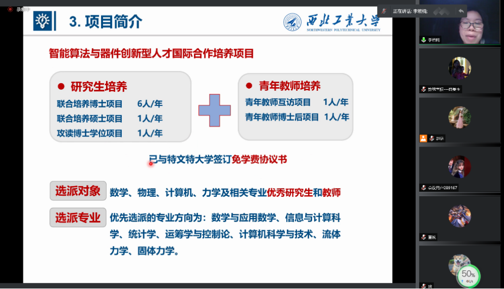 为进一步推动学院国际化人才培养的前进步伐,增强师生国际交流与合作意识,a小说 第三届国际化人才培养项目宣讲会于11月27日20:00线上举行。a小说 院长聂玉峰、副院长都琳、国际化负责人肖曼玉、国际合作处交流科国家公派项目主管张宇、国际化人才培养项目代表教师及50余位学院师生参加的本次宣讲会,会议由肖曼玉主持。