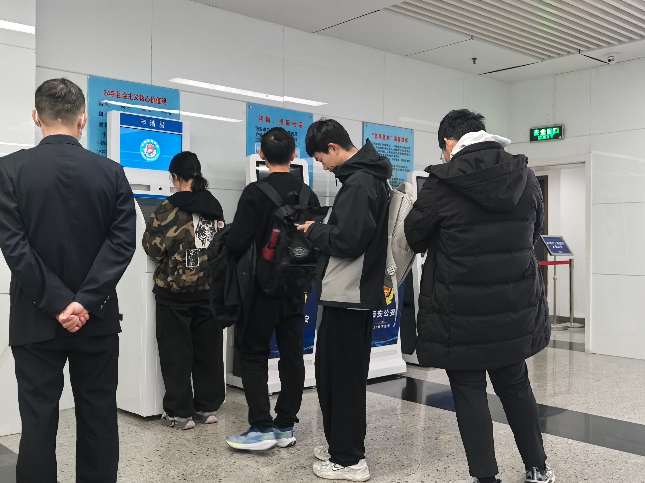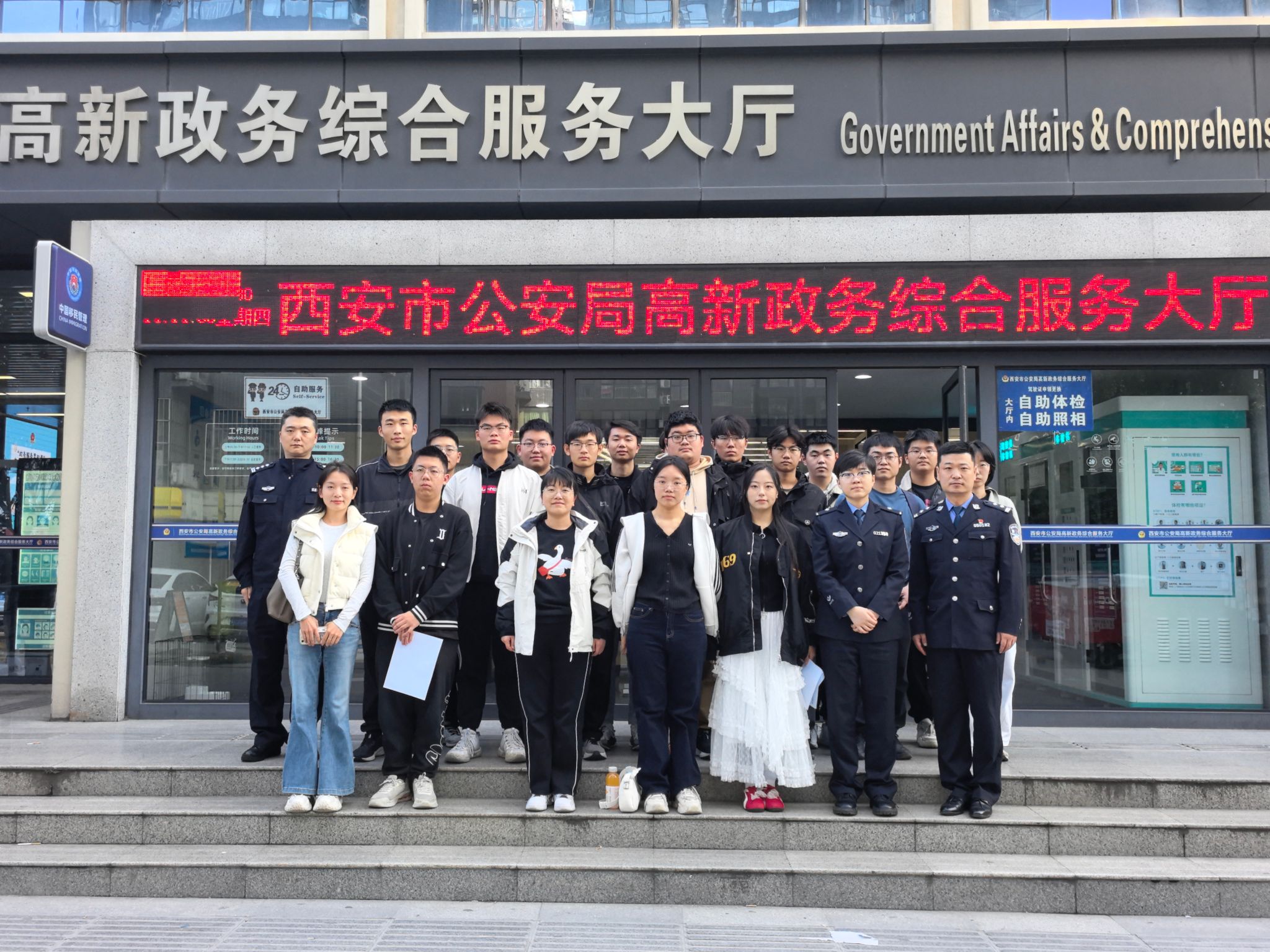 10月30日下午,第一批18名学生准时在指定地点集合,乘坐校车前往高新分局。在派出所工作人员的引导下,同学们有序完成人像采集、申请表打印、材料递交等流程,全程高效快捷,安全返校。11月15日,学院推进第二批服务,组织 27 名学生前往西安市公安局办理护照。在工作人员和志愿者的指引下,学生们顺利完成信息采集核验、缴费登记等全部手续,整场活动规范有序。