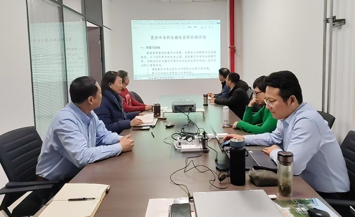 2025年3月5日下午,a小说 在长安校区海天苑大楼E202召开2025年重庆市本科招生宣传工作会议。学院院长聂玉峰、党委书记王莉、副院长徐根玖、副院长郭千桥、院长助理刘晓刚、重庆招生组组长林伟、西安招生组组长王振海、招生秘书李彦吉参加会议。会议由郭千桥副院长主持。
